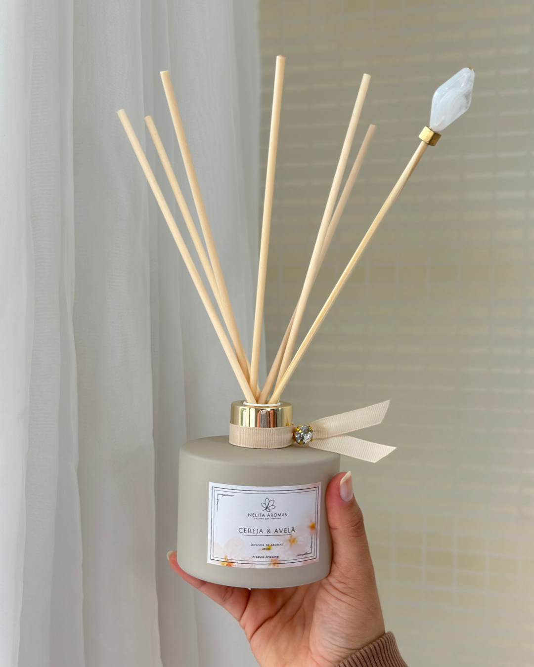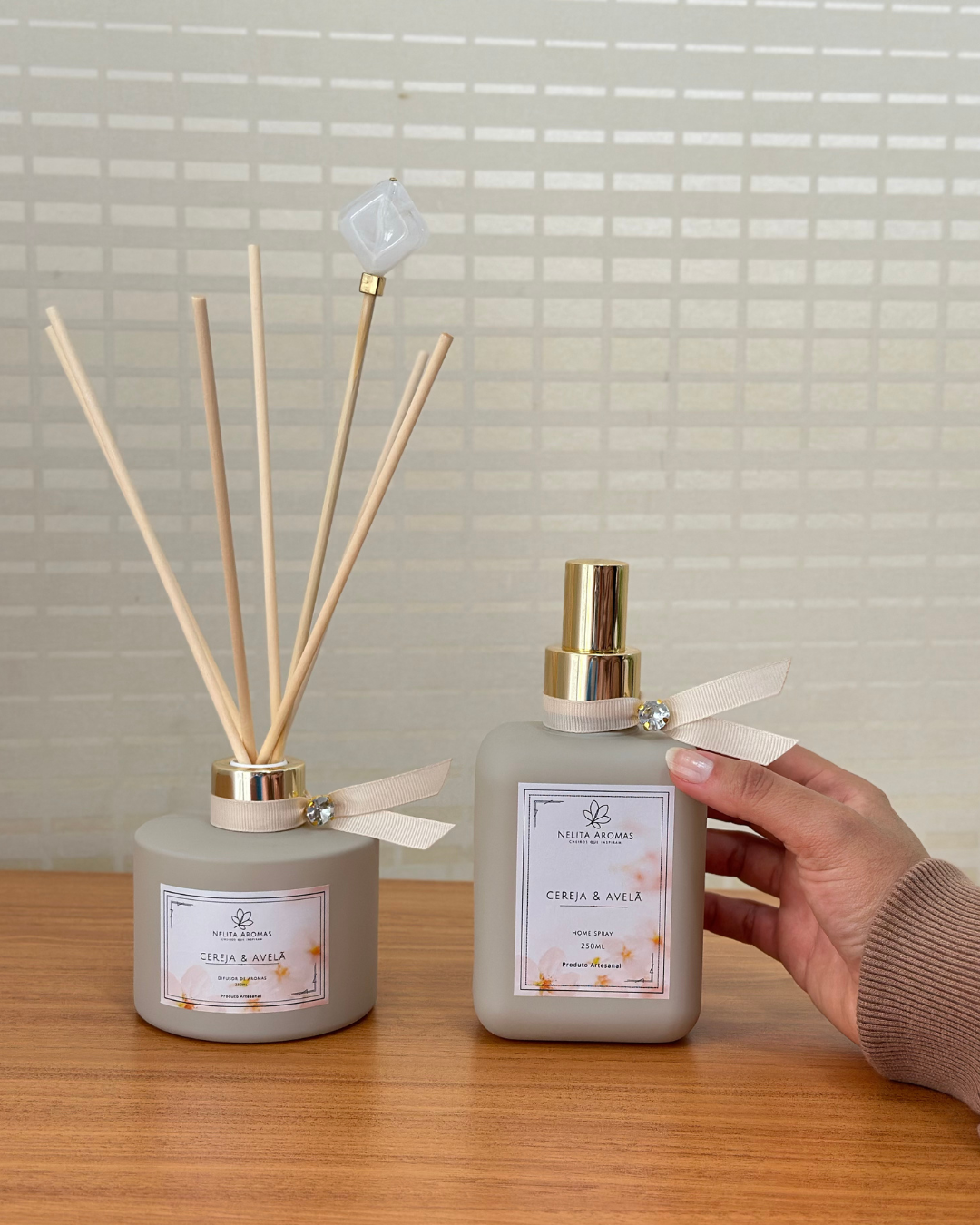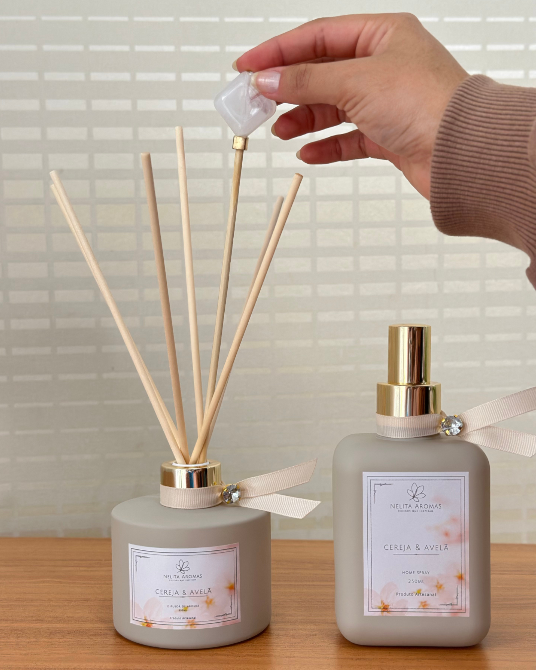 Produzido de forma artesanal, o Kit Cereja & Avelã reflete o cuidado da Nelita Aromas em cada detalhe — da seleção das fragrâncias ao acabamento dos frascos. Um produto pensado para quem valoriza ambientes acolhedores, elegantes e aromas que permanecem na memória.